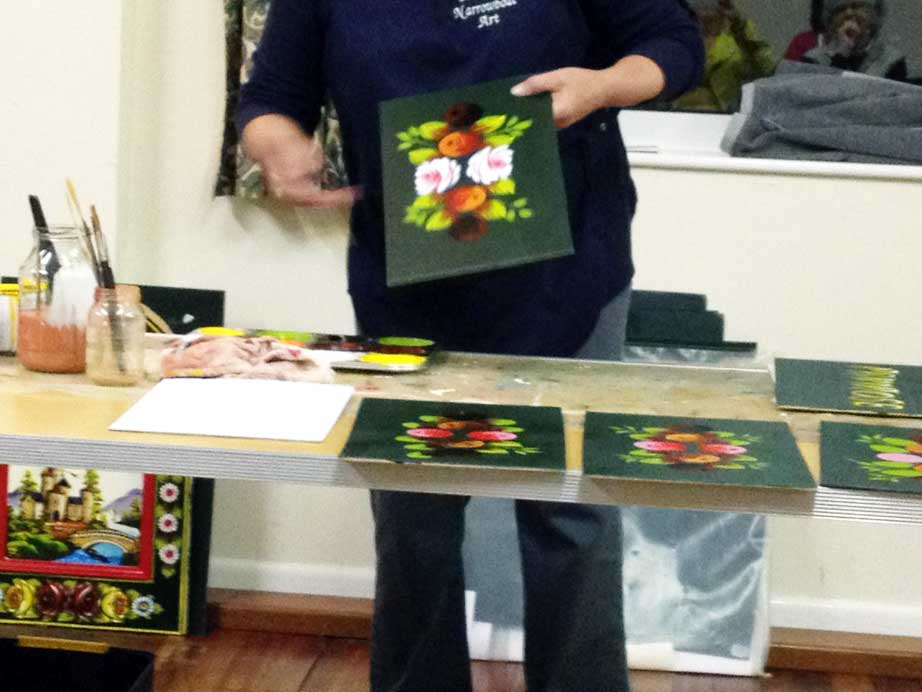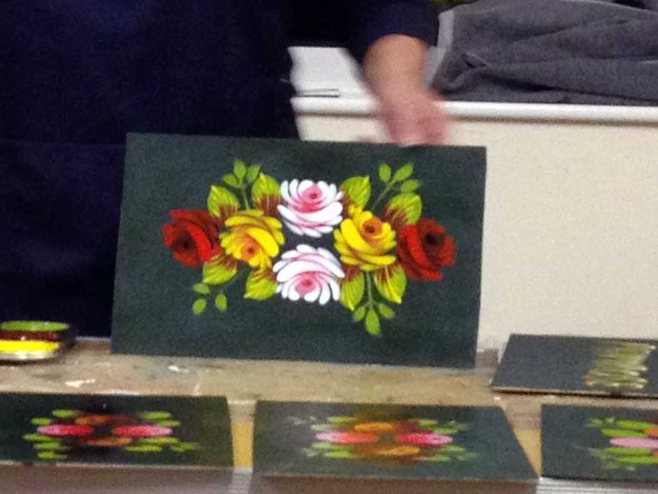 As she talked, Jane gave us a demonstration of how she paints using the very unique brushes and paints. She had prepared a series of panels and was able to show us, stage by stage how to arrive at a beautiful and very colourful panel covered in pink and yellow roses and green veined foliage.