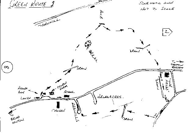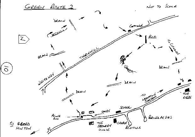 6. Cross the road diagonally on the previous heading, and take the Footbridge and Stile into the next field. Walk to the junction between Green and Brown Routes, and turn hard right. Head for the stile in the corner of the field, and climb it. Take a bearing towards the School buildings (in Winter) or towards the white cottage on the hill (Snowhill) when the leaves are on the trees. Cross the next field diagonally on this line, leaving it by a bridge over the drain. Turn right alongside the drain, and follow round the corner of the next field, leaving it by the Footbridge and Stile. Now follow the Waymarks through the Church Farm property, and behind the other village properties to return to your starting point.