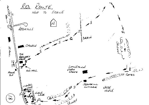 1.Cross the road at the bottom (N.) end of the lay-by near the Telephone Kiosk. Go through the wrought-iron gates and over the stile. Follow the path round the edge of the garden on your left. Turn right over the stile. Walk E. with the hedge on your left, crossing two drains over footbridges and stiles. Go ahead and through the metal gate. Bear left (N.E.) across the next field and through the gate. keep on the same heading across the next field and cross a footbridge and a stile. keep to the lower edge of the next field with the hedge on your left. At the far end (near two metal gates and a cattle trough, turn right.